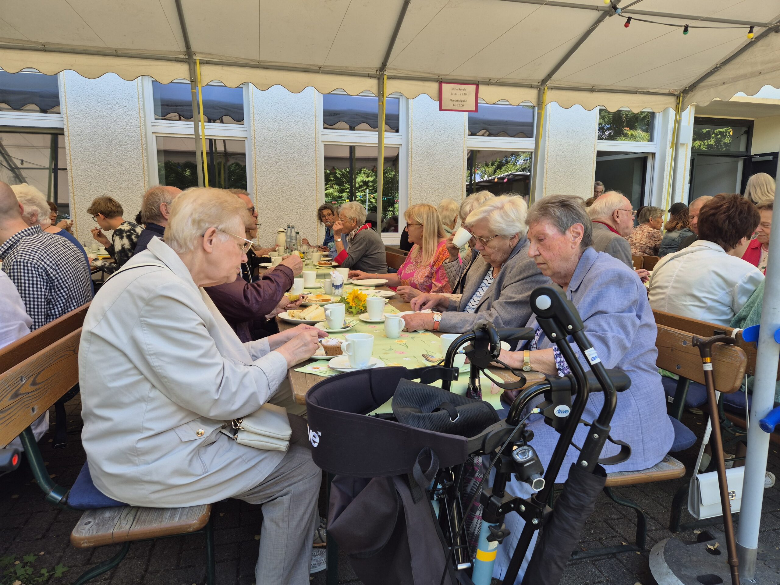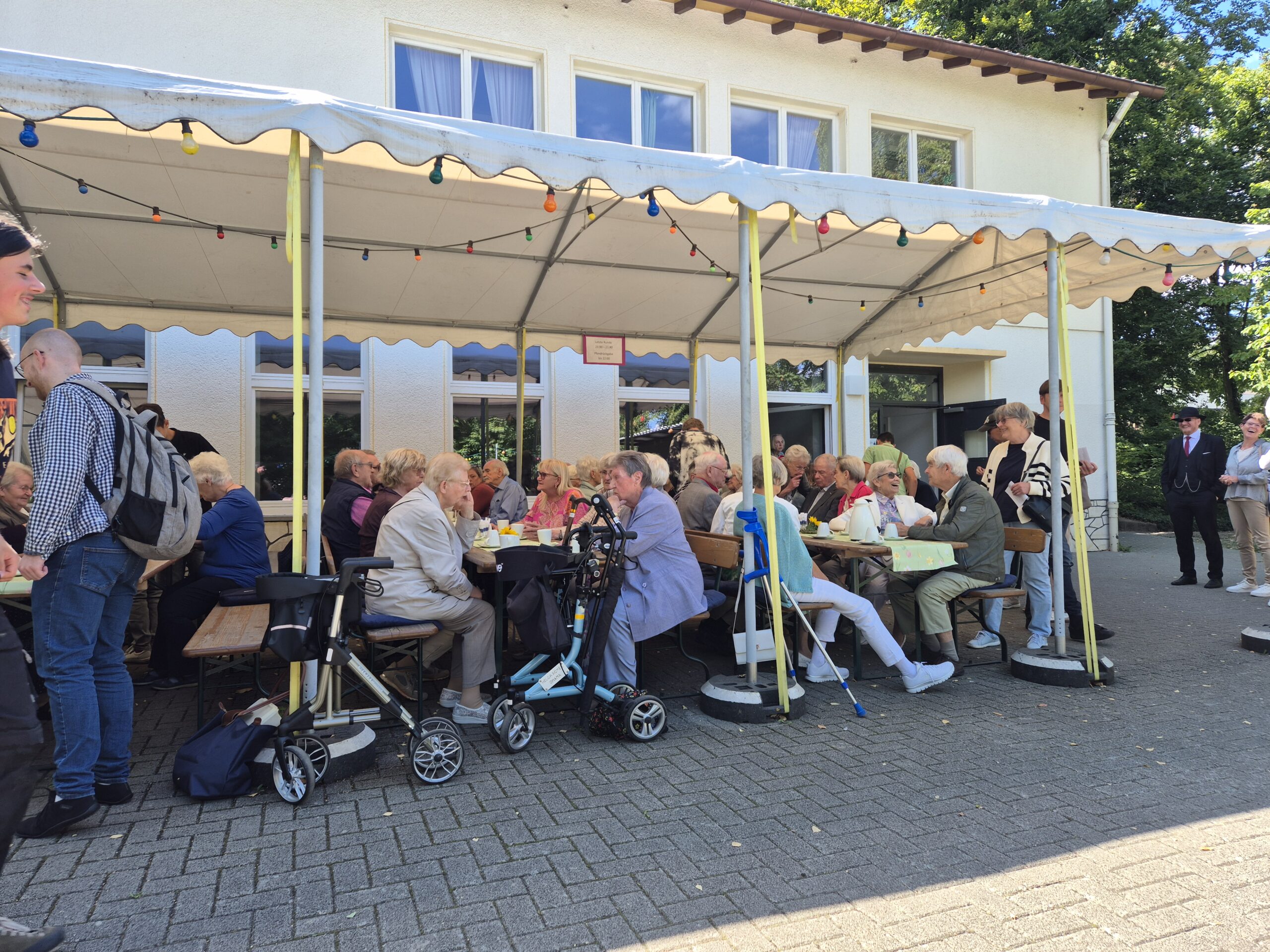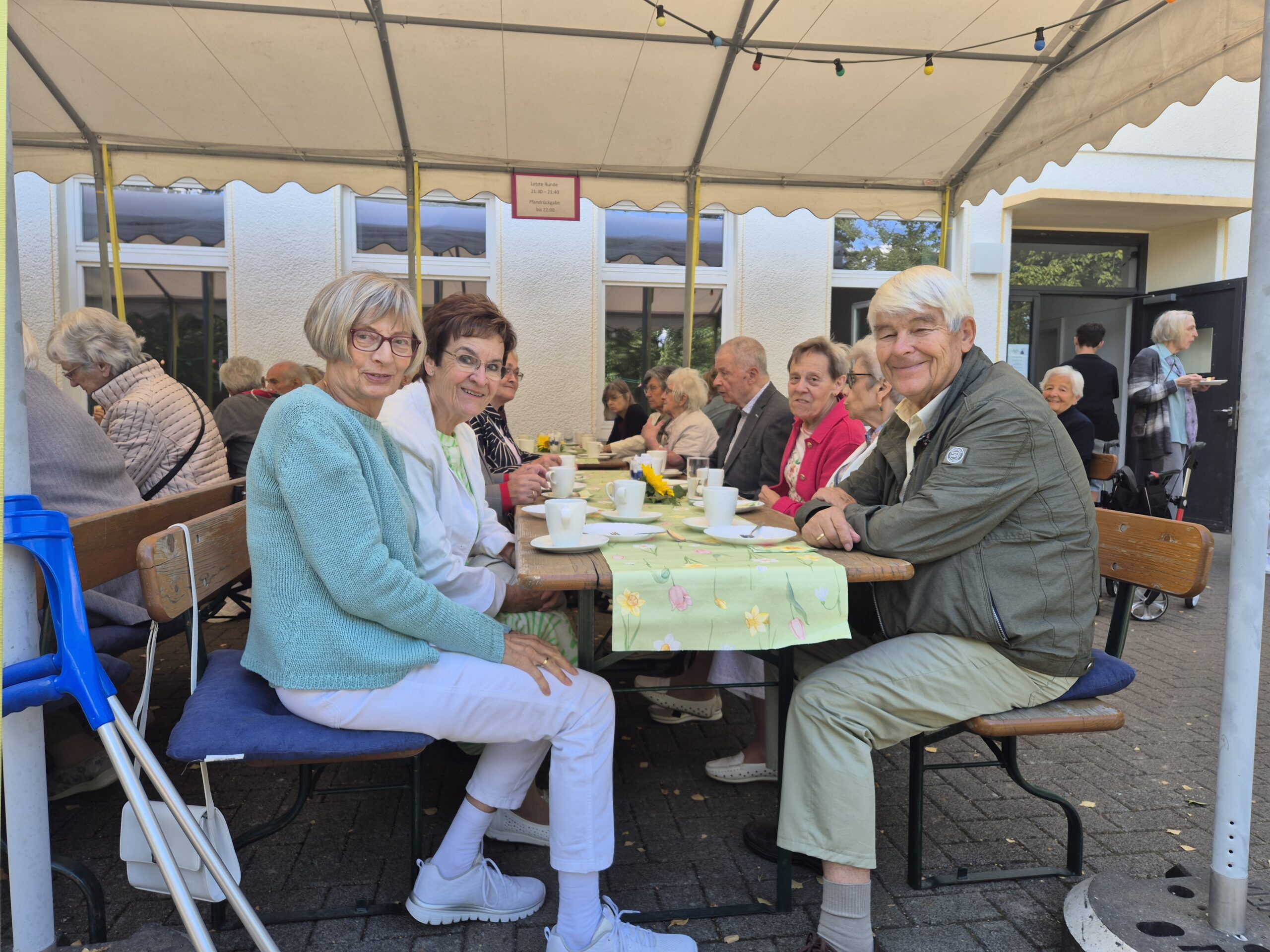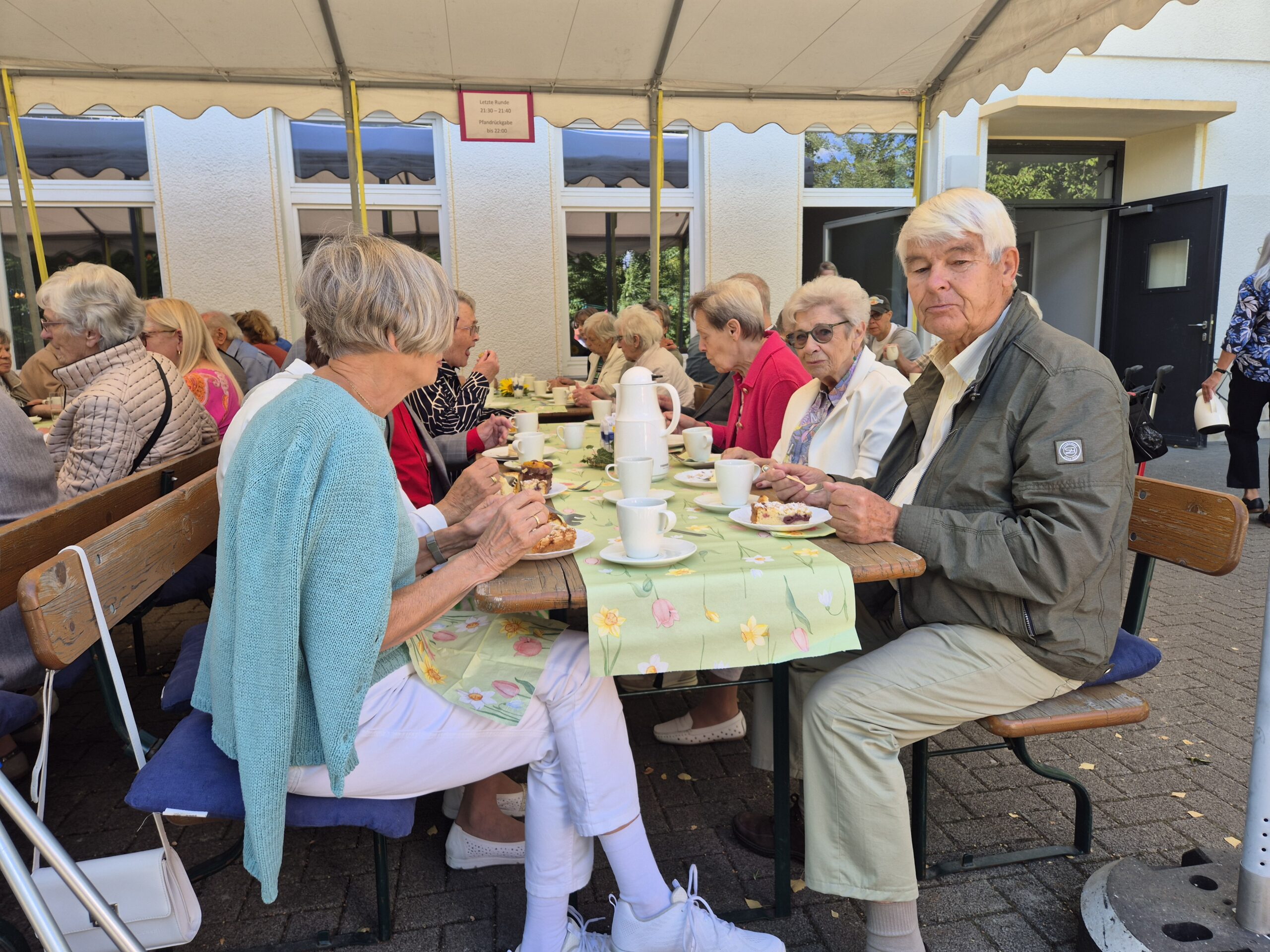Damit entließ Pfr. Ebling die Gottesdienstbesucher in den sonnigen Nachmittag, die fast alle in einem langen Zug zum Gemeindehaus aufbrachen, um mit den Nächsten das Gemeindefest zu feiern. Der Kuchen mundete, und die Konfirmanden schenkten fleißig Kaffee aus, was ihnen und vor allem den Seniorinnen, die so aufmerksam bedient wurden, sichtlich Vergnügen bereitete. In unruhigen Zeiten war das kleine Fest auf dem sonnigen, von Bäumen umgebenen Vorplatz des Gemeindehauses wohltuend wie der Besuch einer kleinen Oase von freundlichem und friedlichem Miteinander.