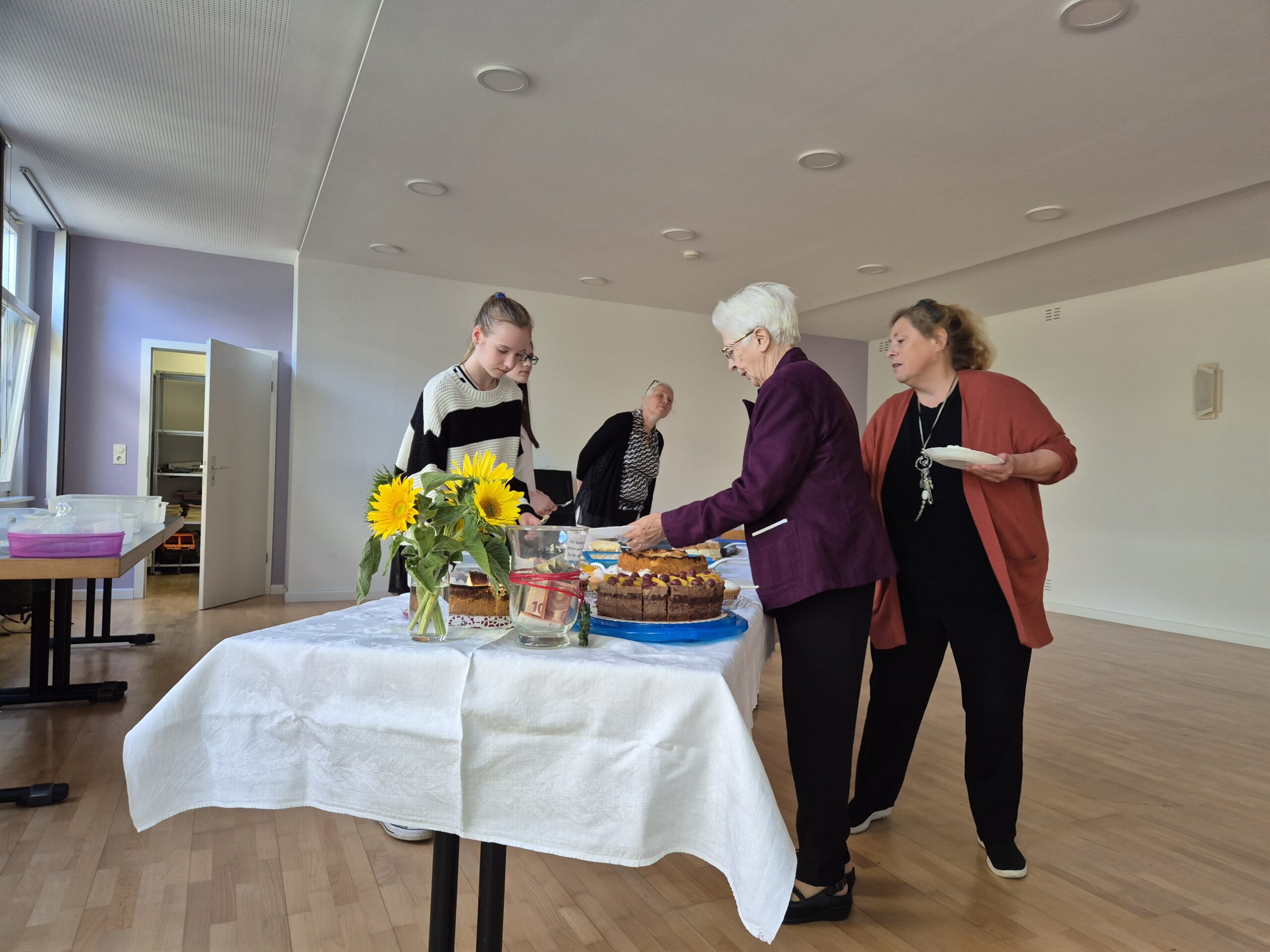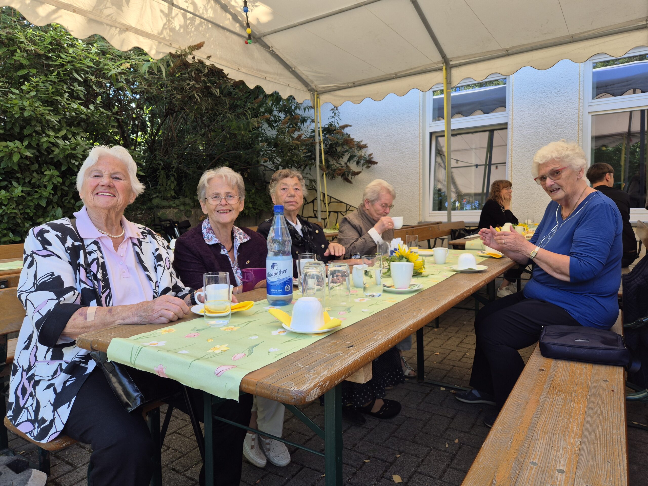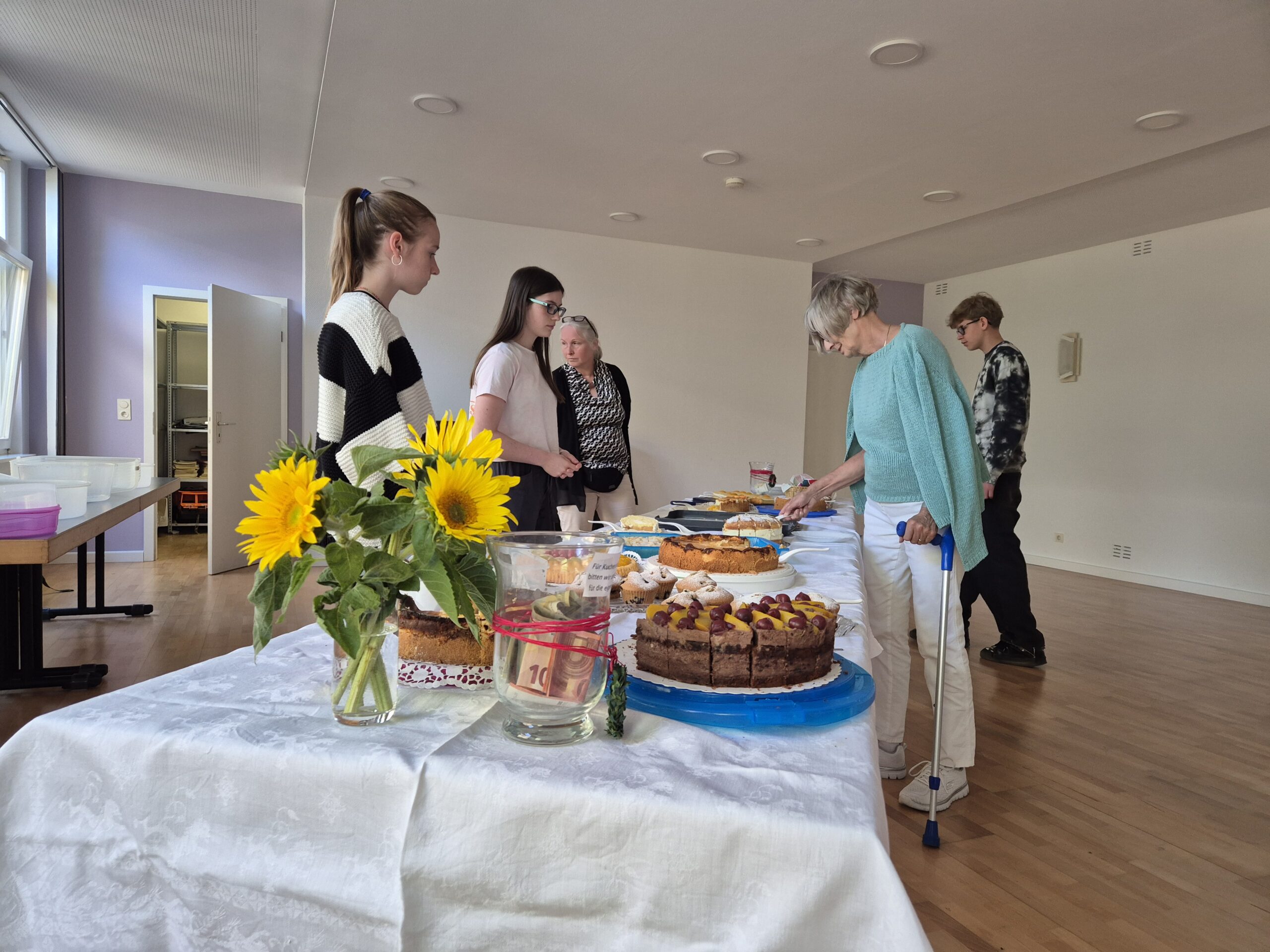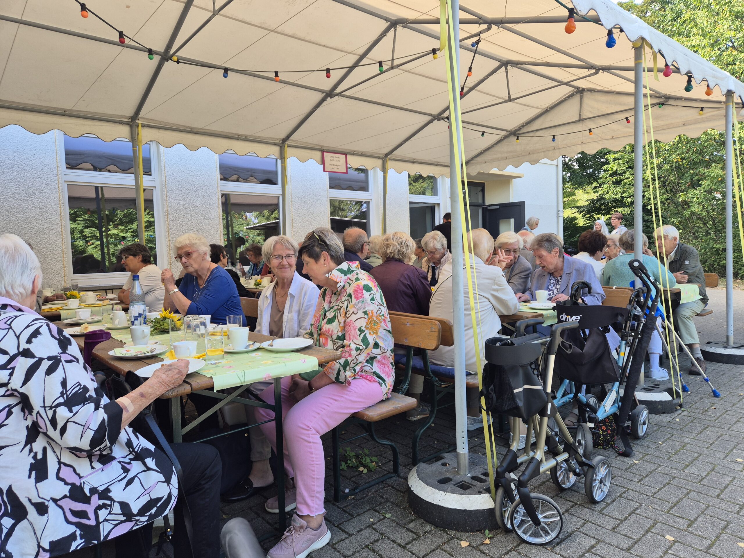 Damit entließ Pfr. Ebling die Gottesdienstbesucher in den sonnigen Nachmittag, die fast alle in einem langen Zug zum Gemeindehaus aufbrachen, um mit den Nächsten das Gemeindefest zu feiern. Der Kuchen mundete, und die Konfirmanden schenkten fleißig Kaffee aus, was ihnen und vor allem den Seniorinnen, die so aufmerksam bedient wurden, sichtlich Vergnügen bereitete. In unruhigen Zeiten war das kleine Fest auf dem sonnigen, von Bäumen umgebenen Vorplatz des Gemeindehauses wohltuend wie der Besuch einer kleinen Oase von freundlichem und friedlichem Miteinander.